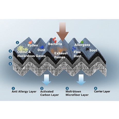 Harmful pollutants like dust, pollen, fungus and foul smelling gases fill the air in the car leading to health related issues. Activated Carbon Cabin Filters from Bosch have an additional layer which absorbs up to 100% of all pollen, dust particles and foul smelling gases and other harmful pollutants entering the vehicle’s interior through its heating, ventilating and air conditioning systems, assuring a healthy and hygienic ambience inside the car.