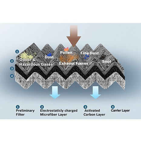 Harmful pollutants like dust, pollen, fungus and foul smelling gases fill the air in the car leading to health related issues. Activated Carbon Cabin Filters from Bosch have an additional layer which absorbs up to 100% of all pollen, dust particles and foul smelling gases and other harmful pollutants entering the vehicle’s interior through its heating, ventilating and air conditioning systems, assuring a healthy and hygienic ambience inside the car.